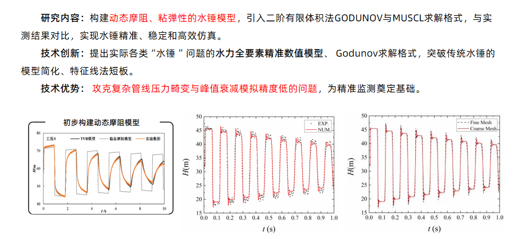 提出多类水锤 问题的水力全要素精准数值模型、Godunov求解格式, 突破传统水锤特征线法短板。攻克复杂管线压力畸变与峰值衰减模拟精度低的问题。