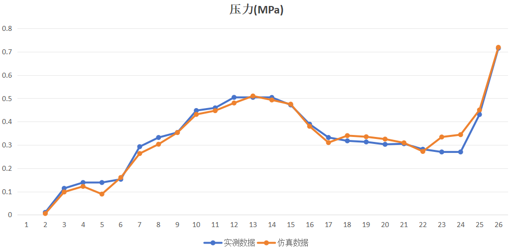 上图为项目调压过程中的中间站点实测数据与仿真数据对比,模型为管线模型,输入数值为上游出站、下游入站处的实时流量,该点仿真输出为压力数据,其纳什系数达到0.9948,模型匹配度良好。