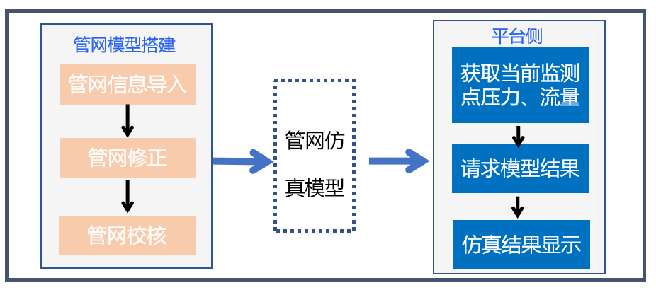 通过水力模型方法,根据少量监测点的测量值,实时仿真全网各处的压力流量数值,通过实测值与仿真值对比,辅助管网异常判断。